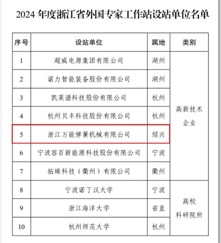 在全球化與科技創(chuàng)新的驅動下,浙江省外國專家工作站成為吸引國際高端人才、推動企業(yè)創(chuàng)新發(fā)展的重要平臺。自2020年《浙江省外國專家工作站管理辦法》實施以來,紹興市在吸引外籍專家方面取得了顯著成績。截至目前,紹興市已有6家單位獲批為省級外國專家工作站,位居全省前列。 2024年,浙江萬能彈簧機械有限公司榮...